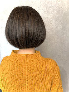 カットは襟足ギリギリまで切って、インナーグラデーションという内側に段を入れていく切り方でシルエットが重くなるようにカットし、内側の見えないところで毛量調整をする事で表面に艶感を残しながら、見た目は重く触ると軽いというスタイルです☆シルエットを重くきることにより再現性も高く自分でもスタイリングしやすいスタイルです♪